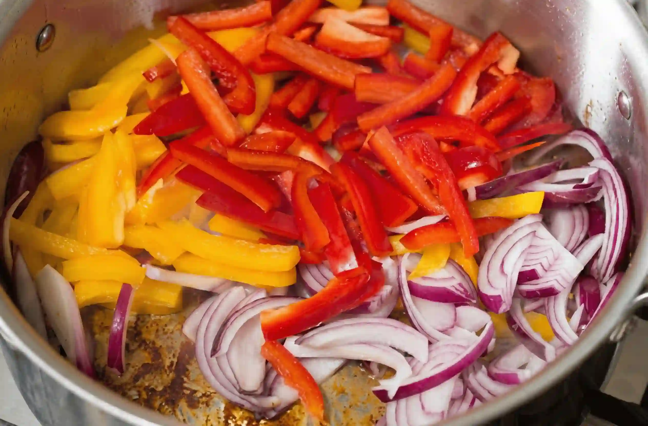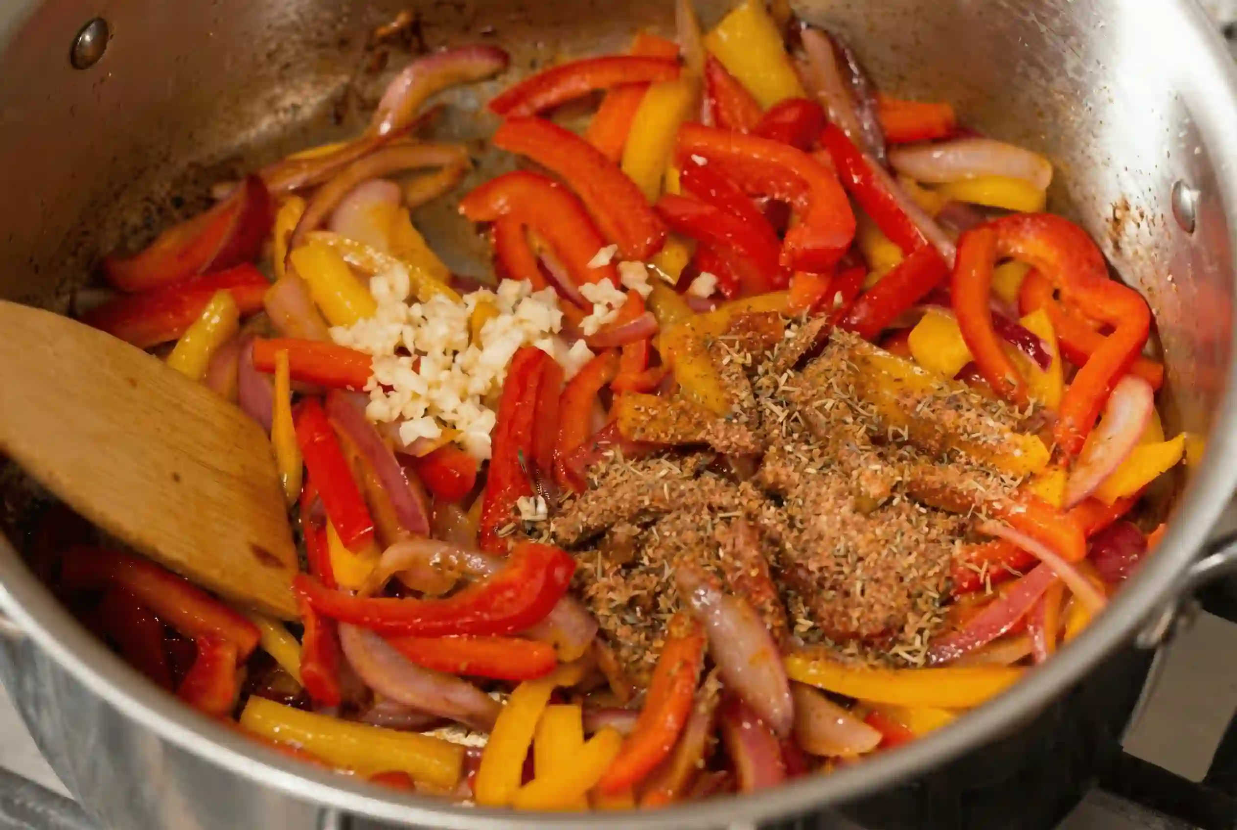 • Add remaining olive oil to the same pot. Add bell peppers and red onion and cook about 3 minutes until slightly softened. Stir in garlic and remaining Cajun seasoning and cook 1 minute until fragrant.