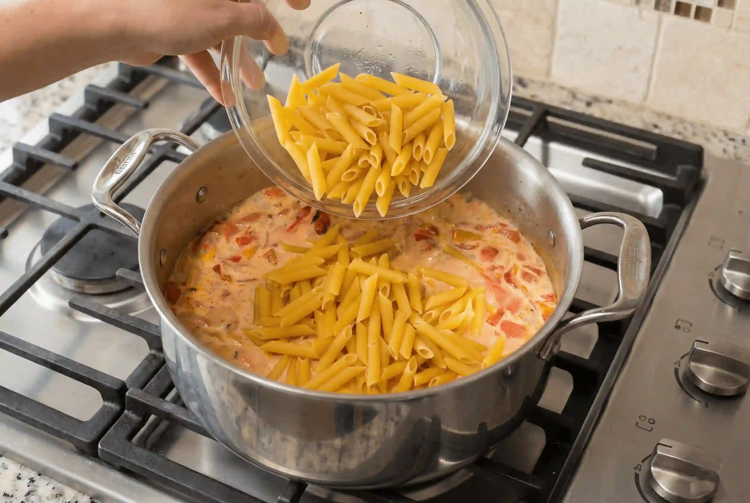• Pour in chicken broth, diced tomatoes, and ½ cup heavy cream. Bring to a gentle boil. Add penne pasta and stir to submerge.